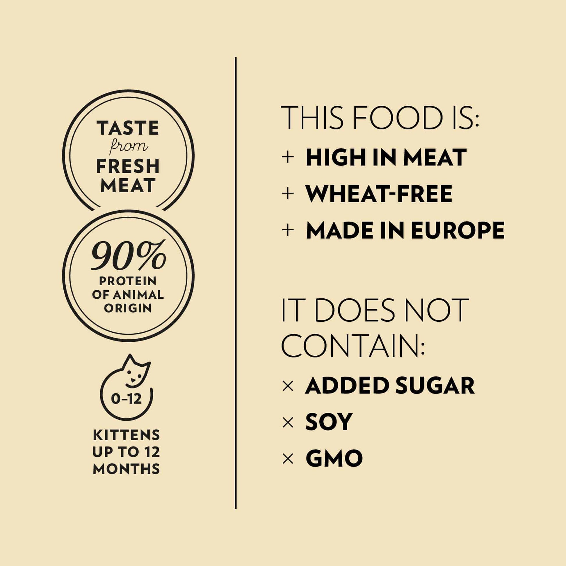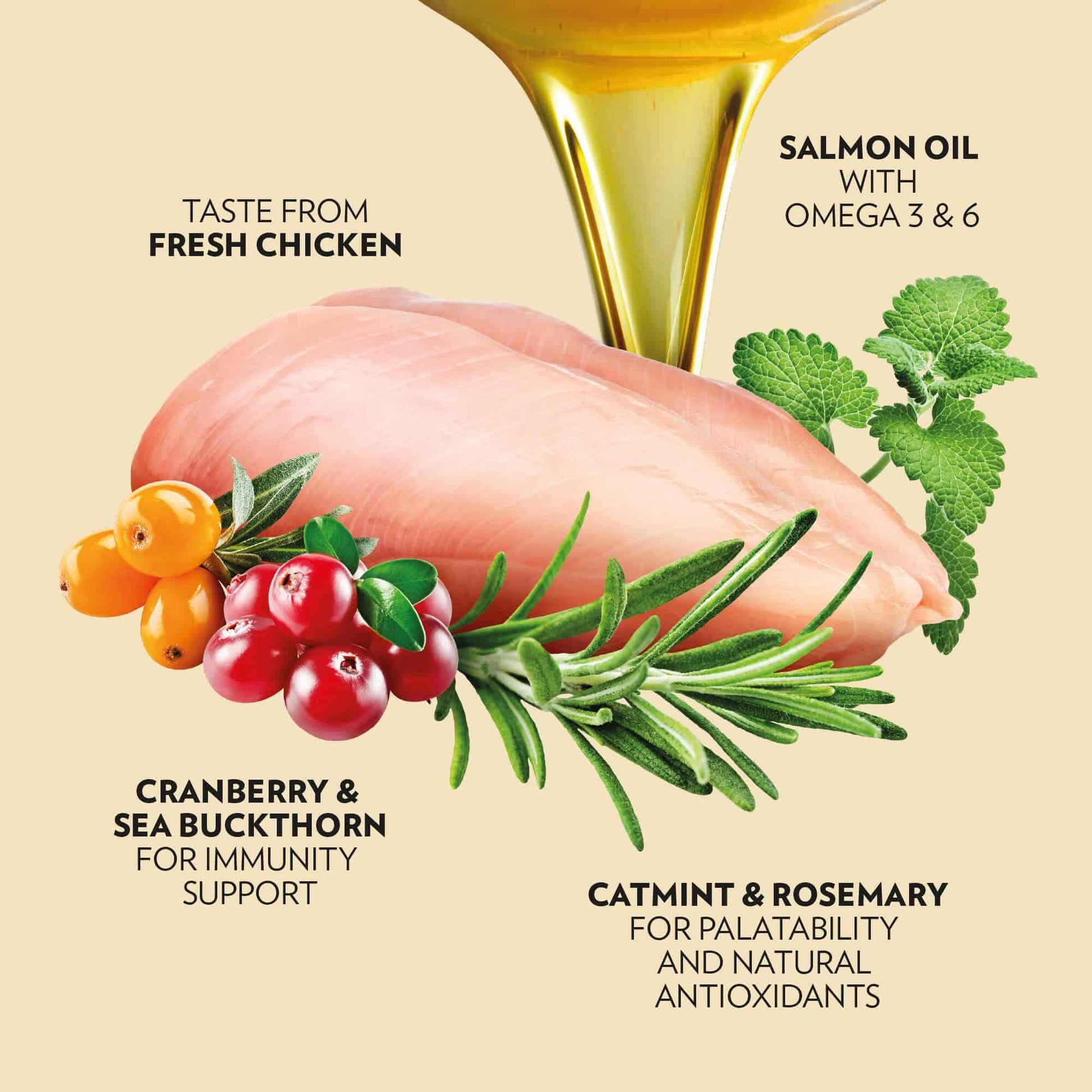 Getrocknetes Hühnerfleisch 40 %, Reis, Hafer, frisches Hühnerfleisch 10 %, Hühnerfett, getrocknete Äpfel, Lachsöl, Bierhefe, Hühnerleber, Präbiotika MOS & FOS (200 mg/kg), Superfood-Mix 500 mg/kg (Sanddorn, Preiselbeere, Katzenminze, Rosmarin, Algen).