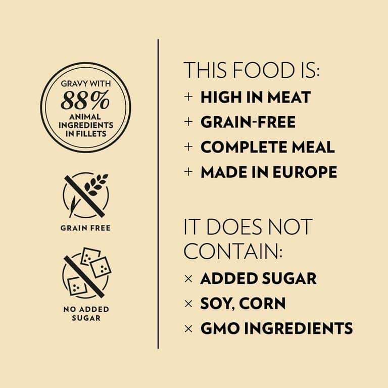 88 % Fleisch und tierische Produkte in Filets (mind. 11 % Lamm), pflanzliche Öle und tierische Fette, Ballaststoffe (0,4 % Inulin), Mineralstoffe. Fleisch-Filet-Verhältnis 50/50.