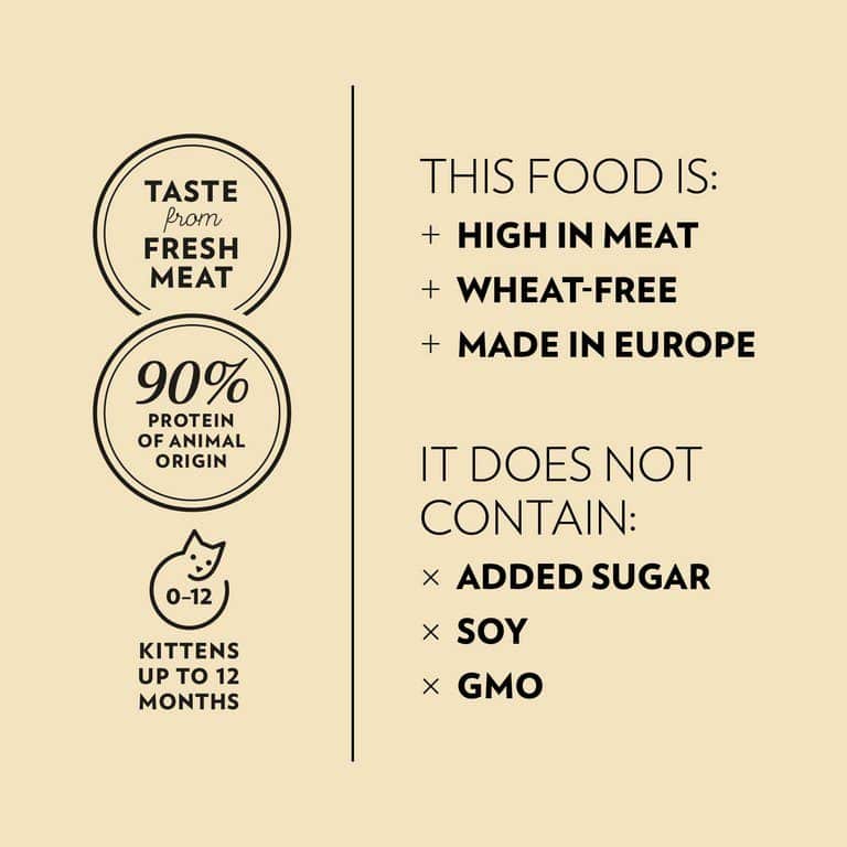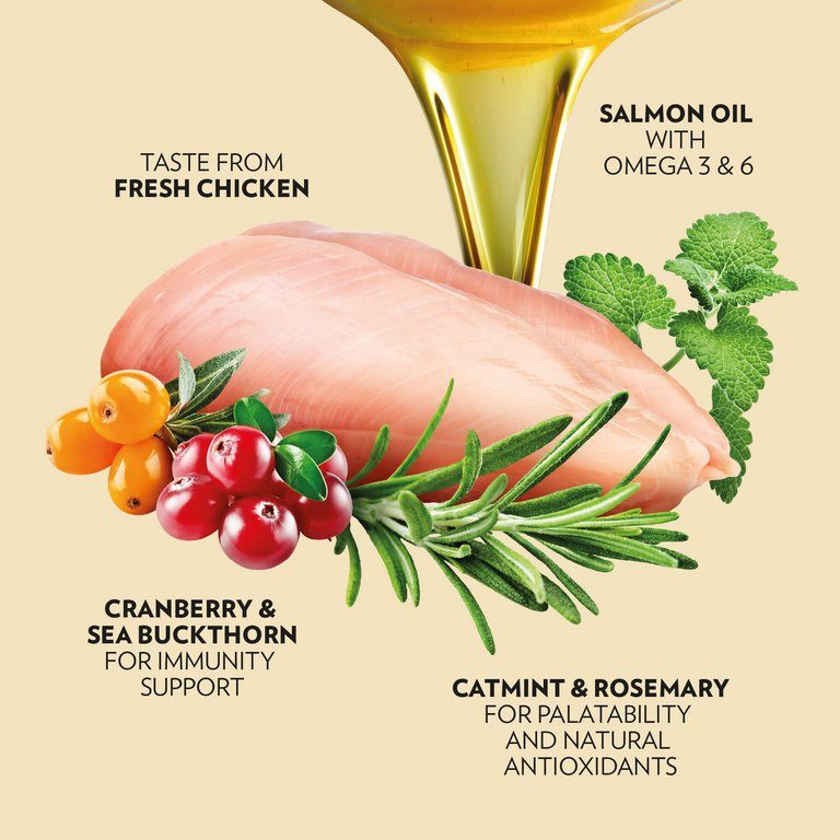 Getrocknetes Hühnerfleisch 40 %, Reis, Hafer, frisches Hühnerfleisch 10 %, Hühnerfett, getrocknete Äpfel, Lachsöl, Bierhefe, Hühnerleber, Präbiotika MOS & FOS (200 mg/kg), Powerfood-Mix 500 mg/kg (Sanddorn, Preiselbeeren, Katzenminze, Rosmarin, Algen)